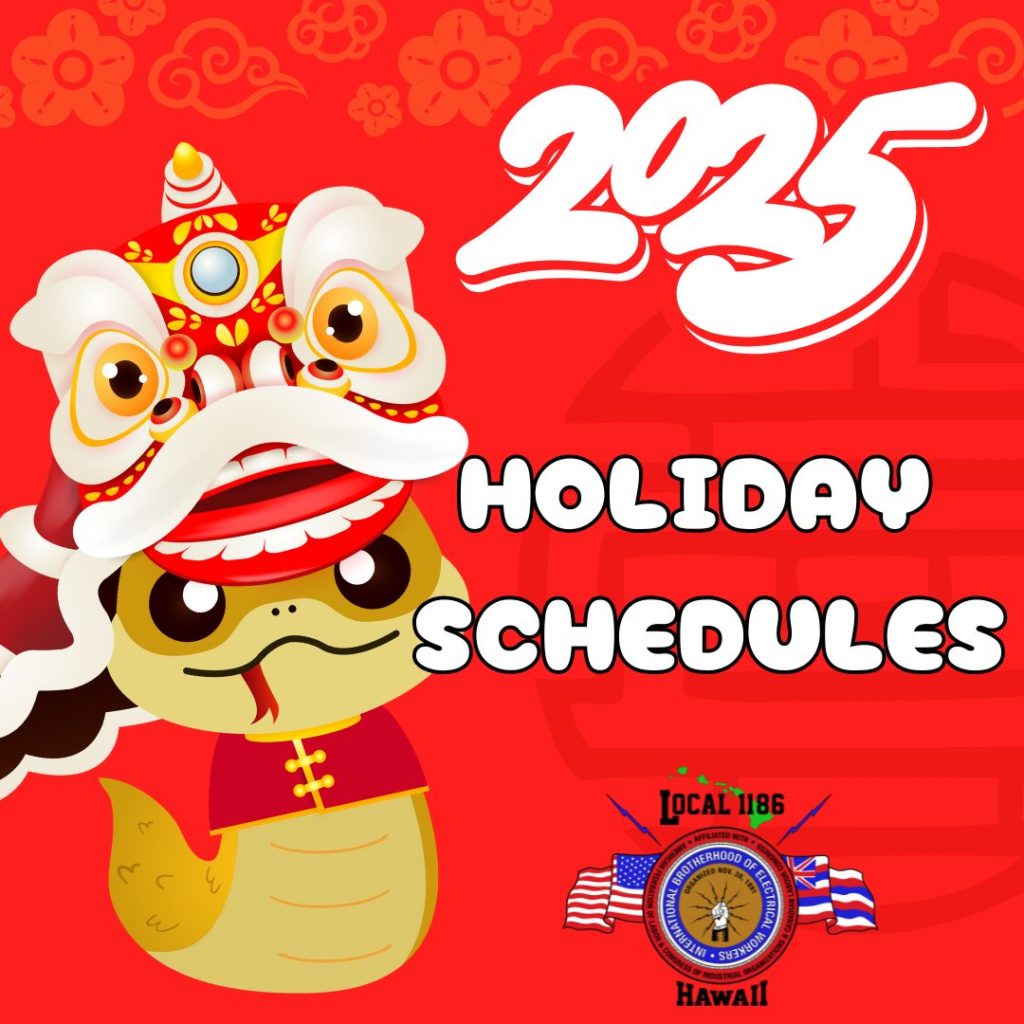 Please see the attached. If you have any questions, please call our office at 808-847-5341. Mahalo!IBEW LOCAL UNION 1186 โ 2026 OFFICE HOLIDAY SCHEDULE