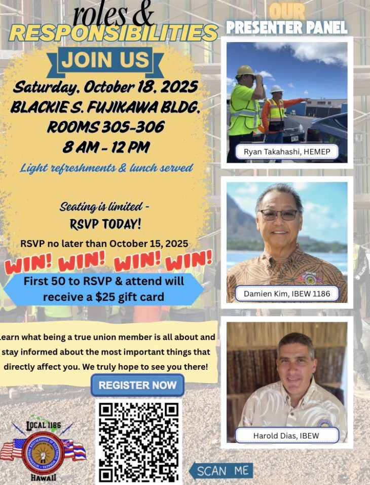 Aloha brothers and sisters, We are excited to present an exciting workshop coming up that everyone should attend – whether you are a veteran member with decades in the union or a first year union member. Learn about all of the roles and responsibilities of being a member of this great union, and be entered […]
