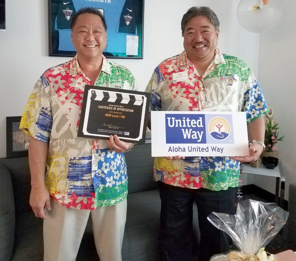 Congrats goes out to IBEW Local Union 1186, for recently being recognized by the Aloha United Way and receiving a “Spirit of Community Award” for its efforts in helping them to raise money for local communities and people in need.