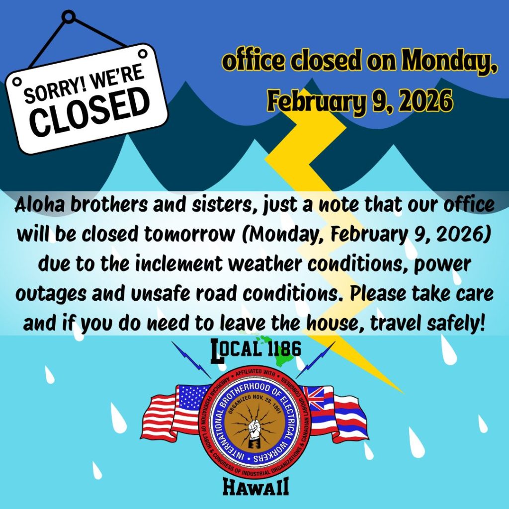 We hope that you and your ‘ohana are safe from this horrible weather we have right now. Due to the flood watch that at the time of this post, goes through Monday afternoon as well as the high wind warning that goes until 6 PM on Monday, our office will be closed tomorrow, Monday, February 9, 2026. The safety of our members firstmost, staff, as well as those who have business at our building are of utmost importance and the unsafe conditions are not suitable for our office to open as usual. Please stay turned to local news for weather updates. We are scheduled to resume business as usual on Tuesday, and will keep you posted here if anything changes. MÄlama pono!
